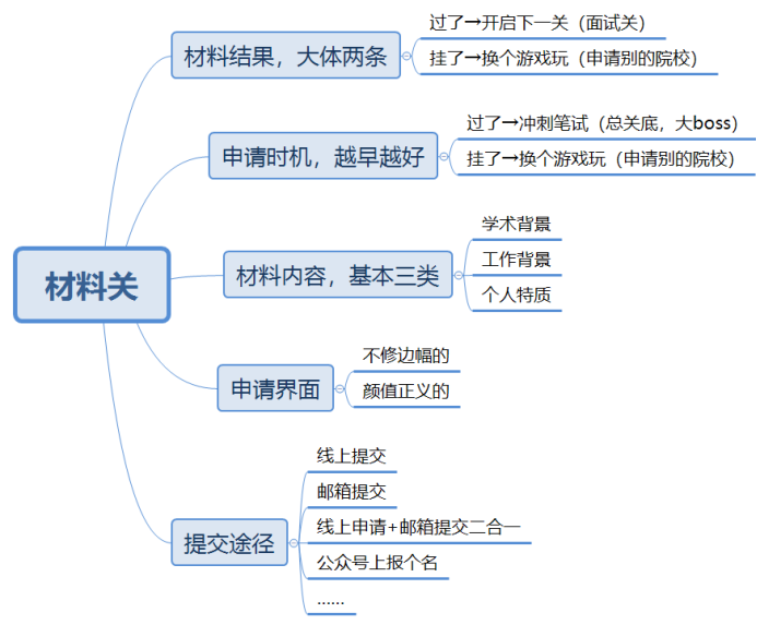 所謂材料關,就是你要向你的目標院校,提交申請材料,表達一下想要來學習的愿望。如果你的申請材料過了,則本關通關成功,進入到面試關;如果你的申請材料掛了,則game over,在提前批階段,你只能換一個游戲玩了(即申請別的院校的提前批面試)。