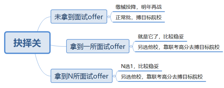 如果你在材料關和面試關,只拿到了一所院校的面試通過,一般來說,就報考這所院校是最穩妥的。如果你面試通過了N所院校,那就得好好想想,憑你的意愿和能力,到底想去、到底能去哪所院校了。