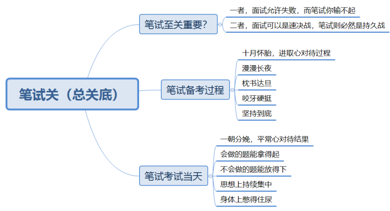 若非要我談談筆試,我只能勉強談談感受。筆試全年的備考,是十月懷胎,是過程;筆試當天的考試,是一朝分娩,是結果。我始終堅信,過程把握好了,結果總不會太差。筆試備考的漫長過程,是漫漫長夜,枕書待旦,咬牙硬挺,堅持到底;而要想筆試當天發揮好,做到四點少不了:“會做的題能拿得起,不會做的題能放得下,思想上持續集中,身體上憋得住尿。”