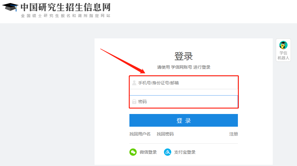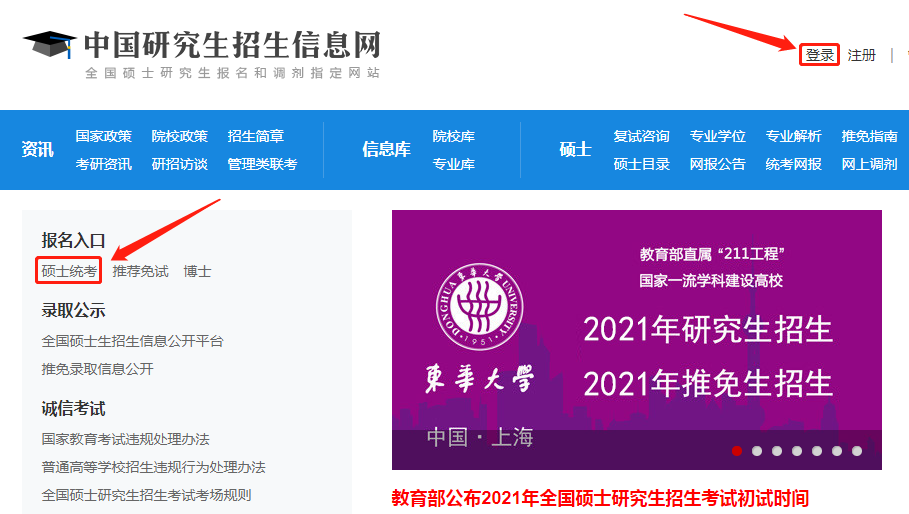 點(diǎn)擊中國(guó)研究生招生信息網(wǎng)首頁(yè)左側(cè)“碩士統(tǒng)考”、或者右上角“登錄”,進(jìn)入以下界面。
