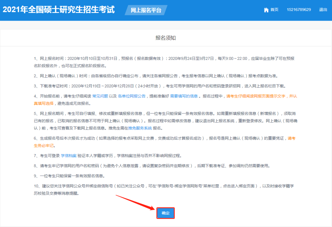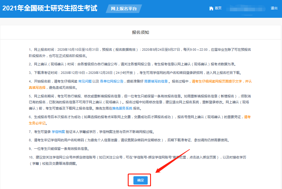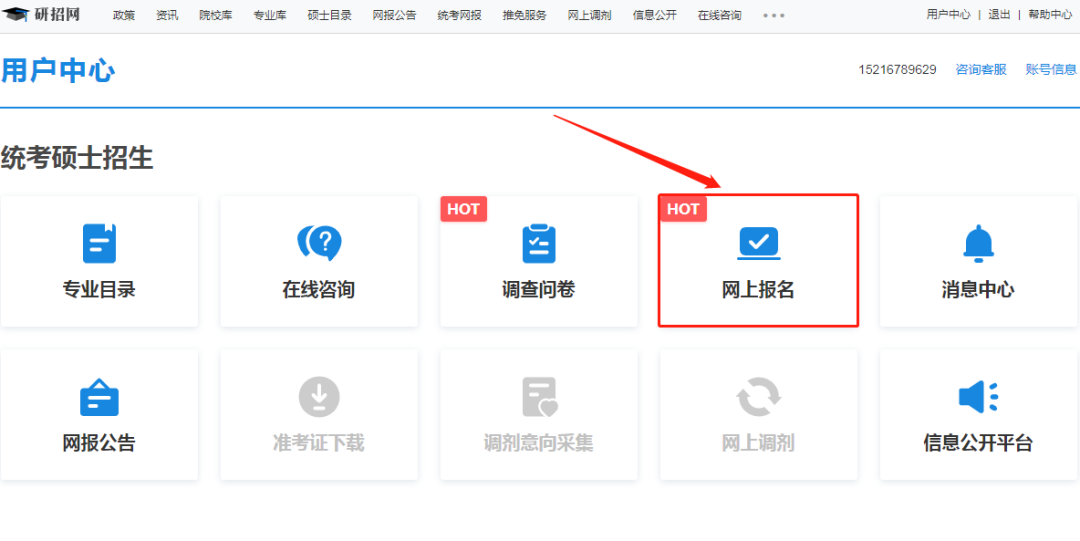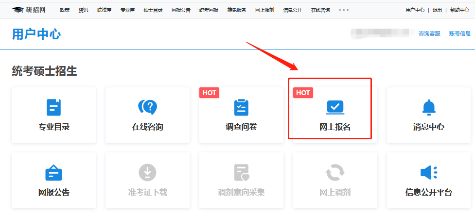 3.進(jìn)入用戶中心頁(yè)面后,點(diǎn)擊“網(wǎng)上報(bào)名”,閱讀報(bào)名須知,點(diǎn)擊“確定”。
