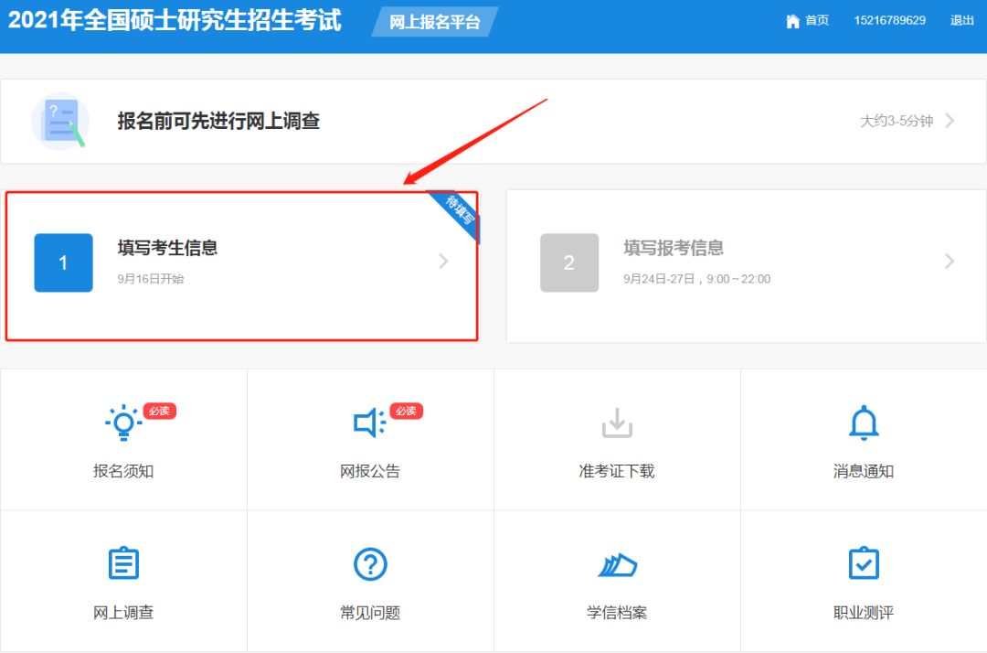 4.完成以上步驟后,可進(jìn)入網(wǎng)上報(bào)名平臺(tái)。網(wǎng)報(bào)系統(tǒng)將報(bào)名分為“填寫考生信息”和“填寫報(bào)考信息”2大步驟。