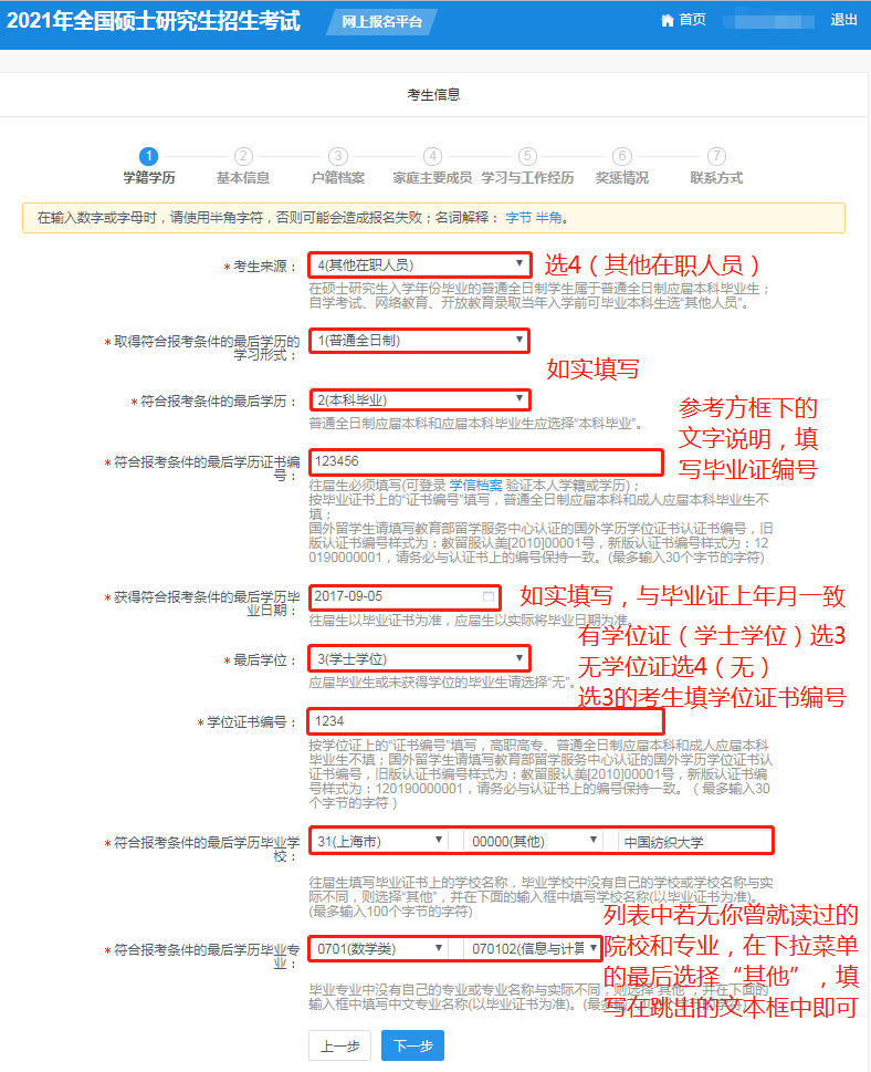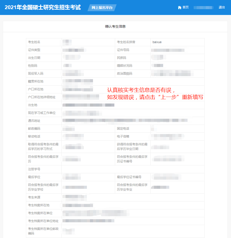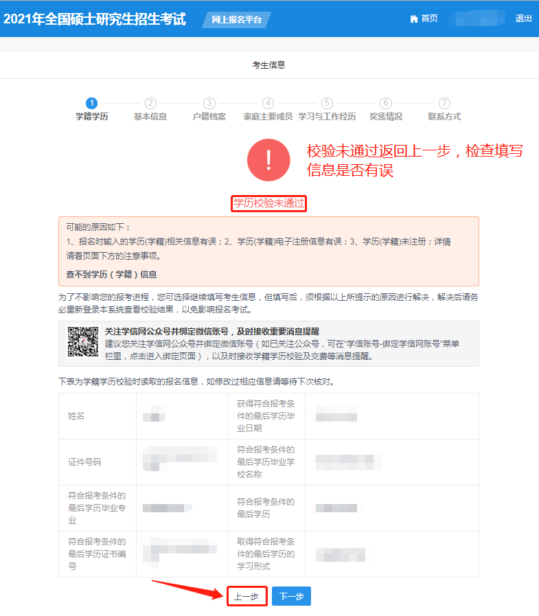 如果發(fā)生“學(xué)歷校驗(yàn)未通過(guò)”的情況,就點(diǎn)擊“上一步”返回檢查。