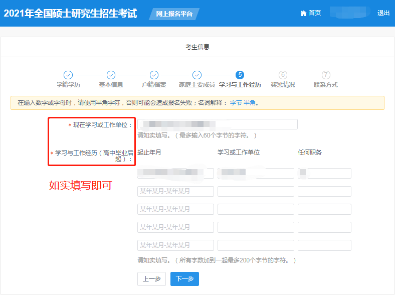 (8)點(diǎn)擊“下一步”進(jìn)行學(xué)習(xí)與工作經(jīng)歷信息填寫。
