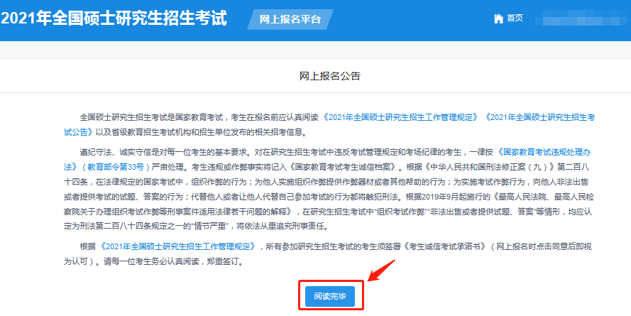 (3)閱讀網(wǎng)上報(bào)名公告,點(diǎn)擊“閱讀完畢”。