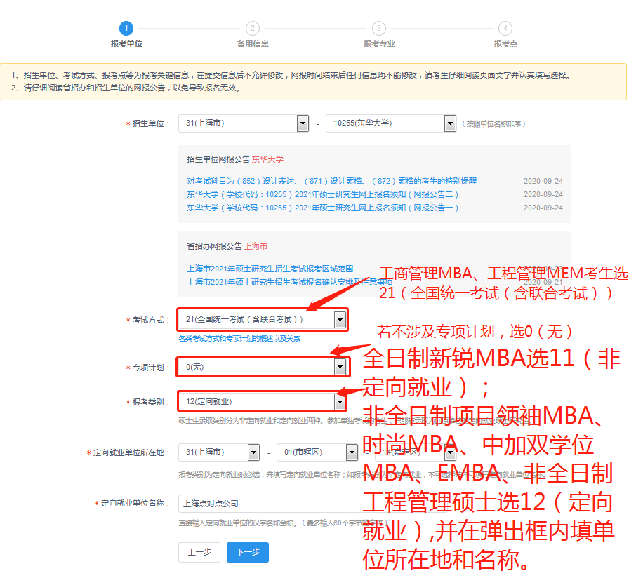 b.報(bào)考125100工商管理(非全日制領(lǐng)袖MBA、非全日制時(shí)尚MBA、非全日制中加雙學(xué)位MBA、非全日制EMBA)、125601工程管理(MEM)的考生選擇“12定向就業(yè)”,并在彈出框內(nèi)填寫目前就業(yè)的單位地址、名稱,報(bào)考期間就業(yè)單位發(fā)生變化不會(huì)影響考生報(bào)考。