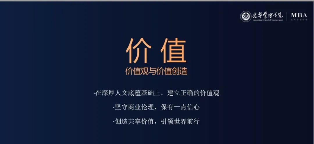 在北京大學深厚人文基礎上,建立正確的價值觀,將商學教育嵌入社會體系當中,培養既能領導企業成長、又具有強烈責任感和高大格局的社會變革推動者,不僅為股東而是為整個社會創造更多共享價值。