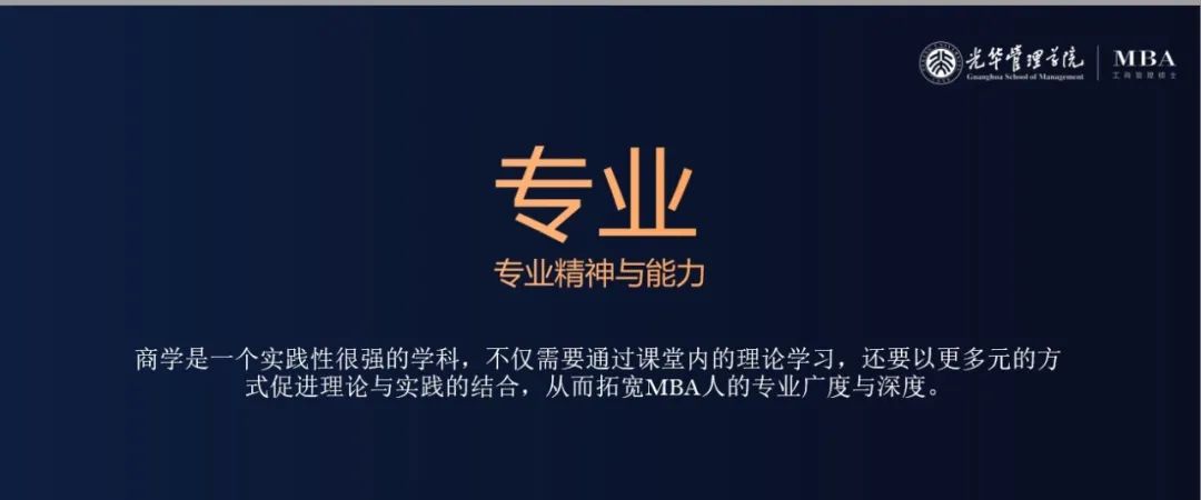 作為商學教育的引領者,北大光華MBA項目要求并期待著,北大光華MBA人能夠在不同考量中做好取舍,平衡組織和員工利益、代際之間的公平和正義、環境和人類的發展、經濟和社會的協同、職業和家庭的平衡、創新與參與機會,效率和公平正義以及——今天的繁榮與明天的空間。
