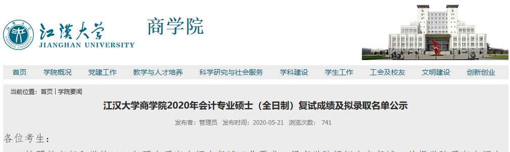 江漢大學商學院2020年會計專業碩士(全日制)復試成績及擬錄取名單公示