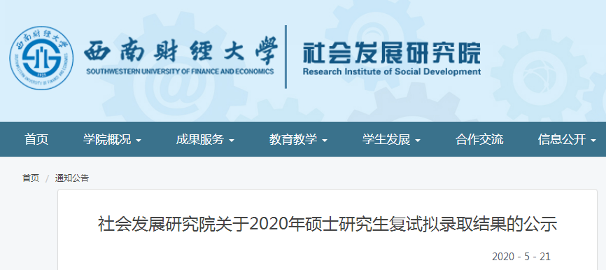 根據教育部碩士研究生招生工作相關規定,按照學校相關要求和工作安排,社會發展研究院2020年碩士研究生復試錄取工作已順利完成。報經學校招生領導小組審核后,現將擬錄取結果公示如下(詳見附件)。考生亦可通過西南財經大學研究生招生網(http://yz.swufe.edu.cn/)查詢本人復試詳細成績及錄取狀態。