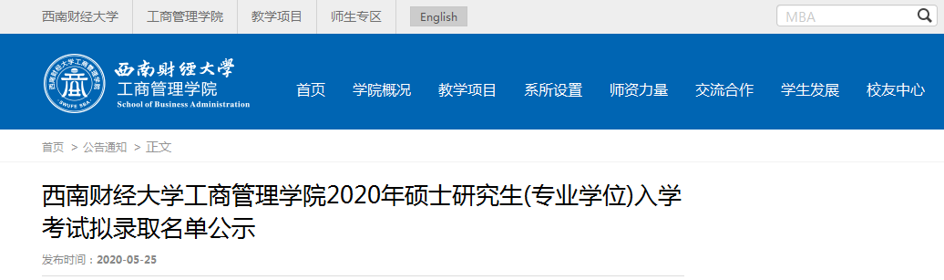 根據教育部相關文件要求,經學院研究生招生工作領導小組審核同意,現將工商管理學院2020年工商管理碩士(MBA)入學考試擬錄取名單予以公示(名單請見附件),公示期為10個工作日(自公示之日起計算)。考生也可通過西南財經大學研究生招生網查詢本人復試詳細成績及錄取狀態。公示期間,如有異議,請與學院聯系。
