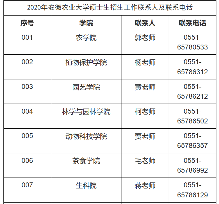 現(xiàn)發(fā)布安徽農(nóng)業(yè)大學(xué)2020年碩士生招生待錄取名單(截至5月31日),如有問題,請及時與報考學(xué)院聯(lián)系,各學(xué)院聯(lián)系方式詳見下表。最終錄取結(jié)果以安徽省教育招生考試院的審批為準。