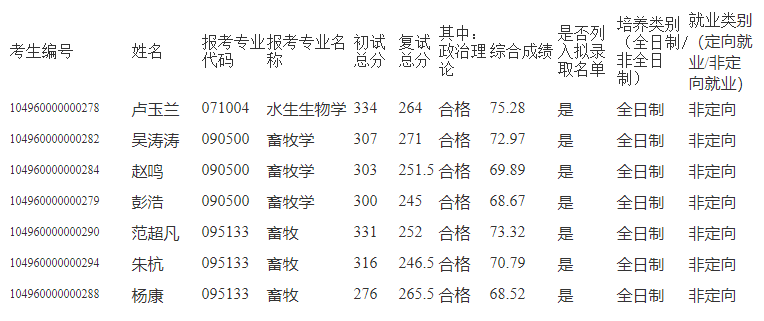 以上就是“2020考研擬錄取名單:武漢輕工大學(xué)動物科學(xué)與營養(yǎng)工程學(xué)院一志愿考生擬錄取名單”的全部內(nèi)容,更多錄取名單相關(guān)內(nèi)容,請持續(xù)關(guān)注!