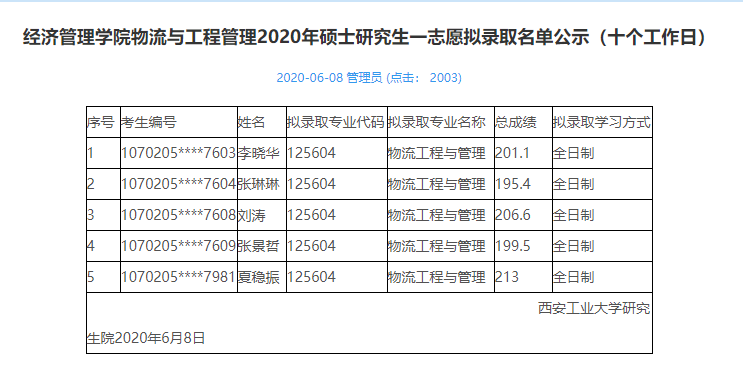 2020考研擬錄取名單:2020年西安工業大學經濟管理學院物流工程與管理專業擬錄取名單公示