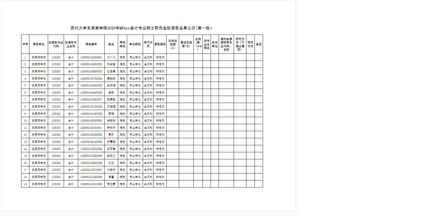 2020考研擬錄取名單:蘇州大學東吳商學院2020年MPAcc會計專業碩士研究生擬錄取名單公示