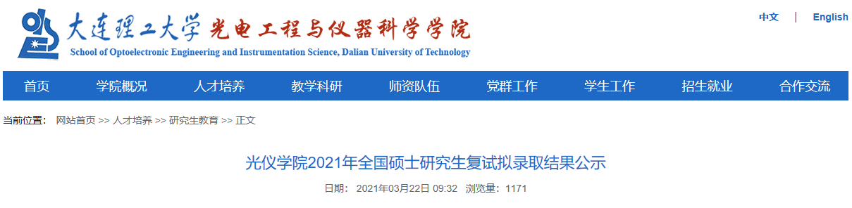 2021考研擬錄取名單:大連理工大學光儀學院2021年碩士研究生擬錄取名單