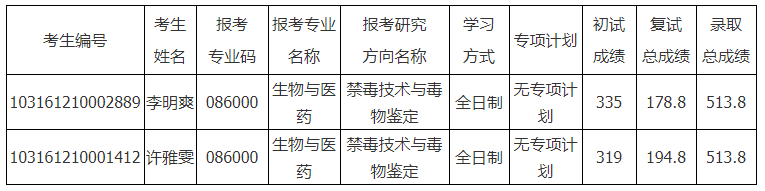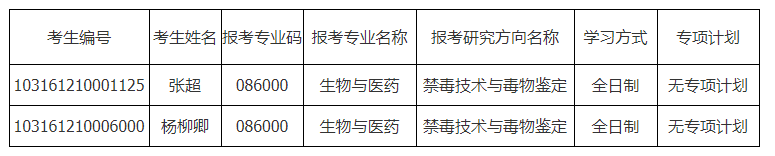 我校已擬錄取的2021年生物與醫藥-禁毒技術與毒物鑒定專業碩士研究生張超、楊柳卿,向我校書面提出放棄擬錄取資格申請,現取消其碩士研究生擬錄取資格。