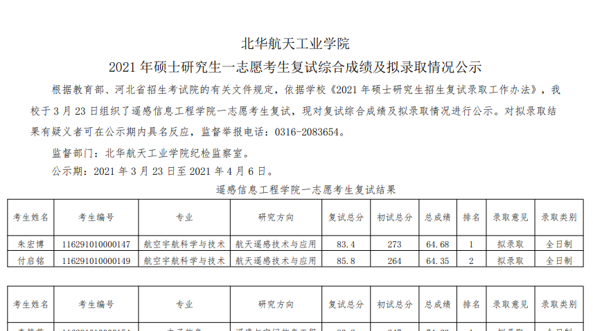以上就是“2021考研擬錄取名單:北華航天工業學院遙感信息工程學院考生復試結果、調劑擬錄取公示 ”的全部內容,更多錄取名單相關內容點擊2021考研擬錄取名單:全國各大院校2021年碩士研究生擬錄取名單匯總!查看詳情!