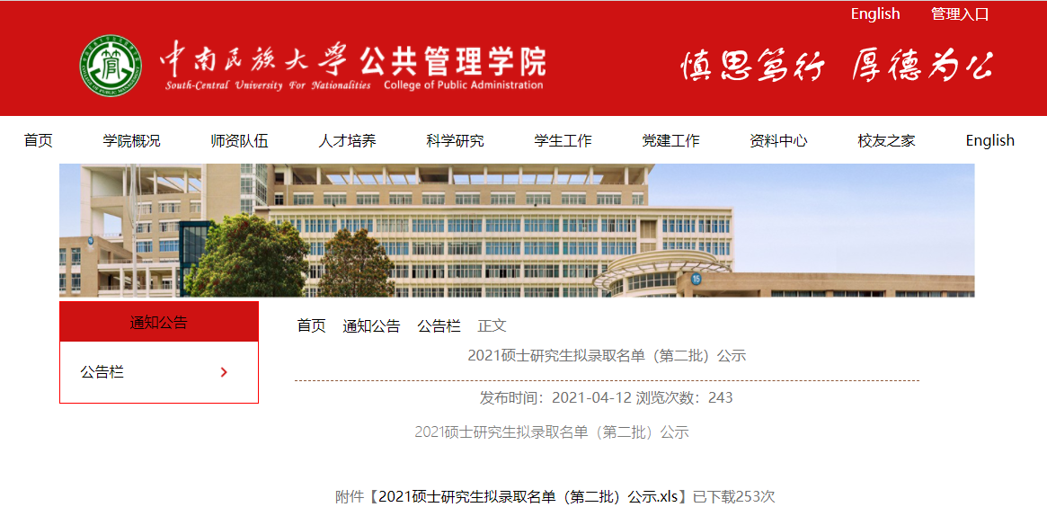 2021考研擬錄取名單:中南民族大學(xué)公共管理學(xué)院2021碩士研究生擬錄取名單(第二批)公示