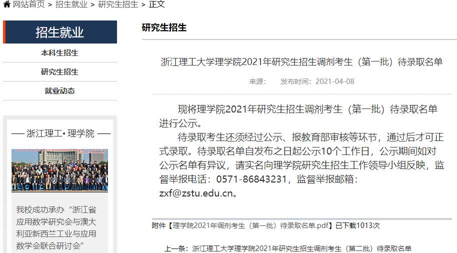待錄取考生還須經過公示、報教育部審核等環節,通過后才可正式錄取。待錄取名單自發布之日起公示10個工作日,公示期間如對公示名單有異議,請實名向理學院研究生招生工作領導小組反映,監督舉報電話:0571-86843231,監督舉報郵箱:zxf@zstu.edu.cn。