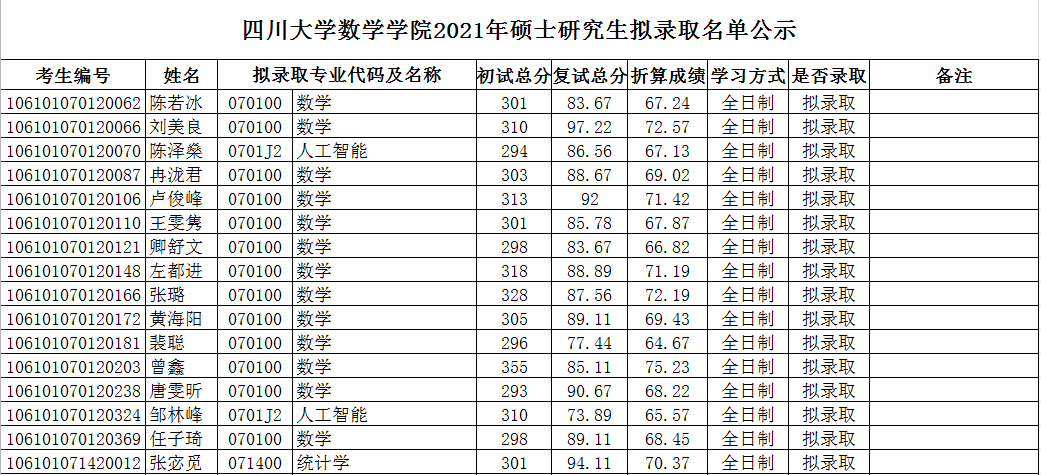 原文標(biāo)題:四川大學(xué)數(shù)學(xué)學(xué)院2021年碩士研究生擬錄取名單公示