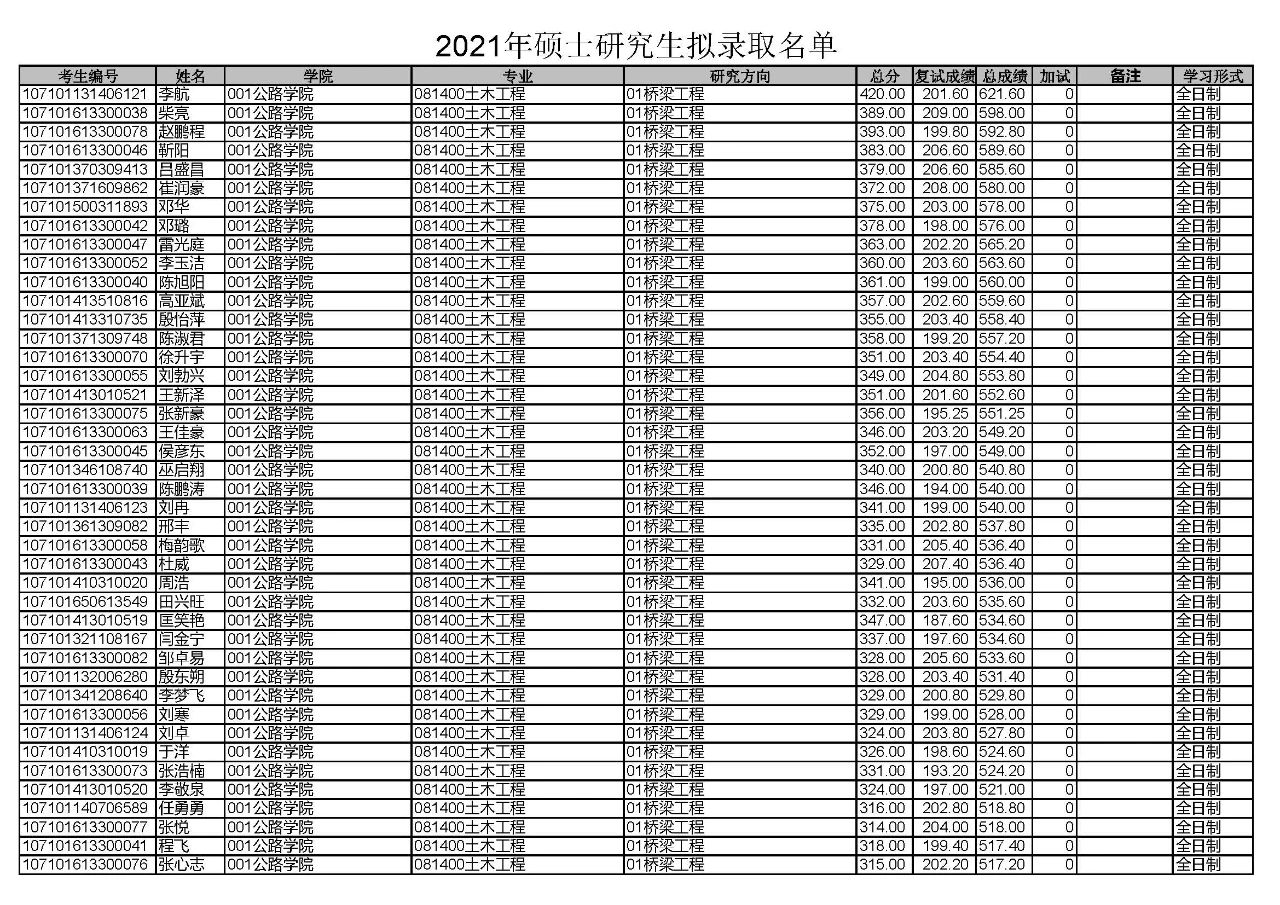 現將長安大學2021年碩士研究生擬錄取名單予以公示,公示時間4月9日-4月23日,如有異議,可于公示期內向學校反映。