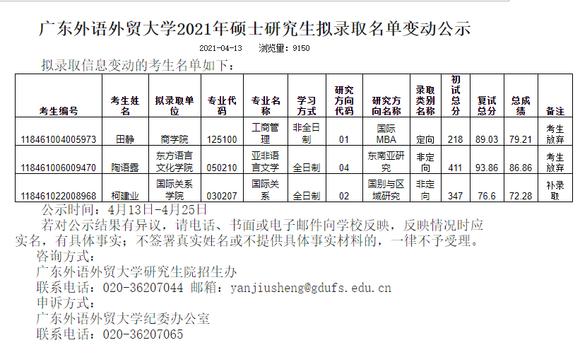 原文標題:廣東外語外貿(mào)大學2021年碩士研究生擬錄取名單變動公示