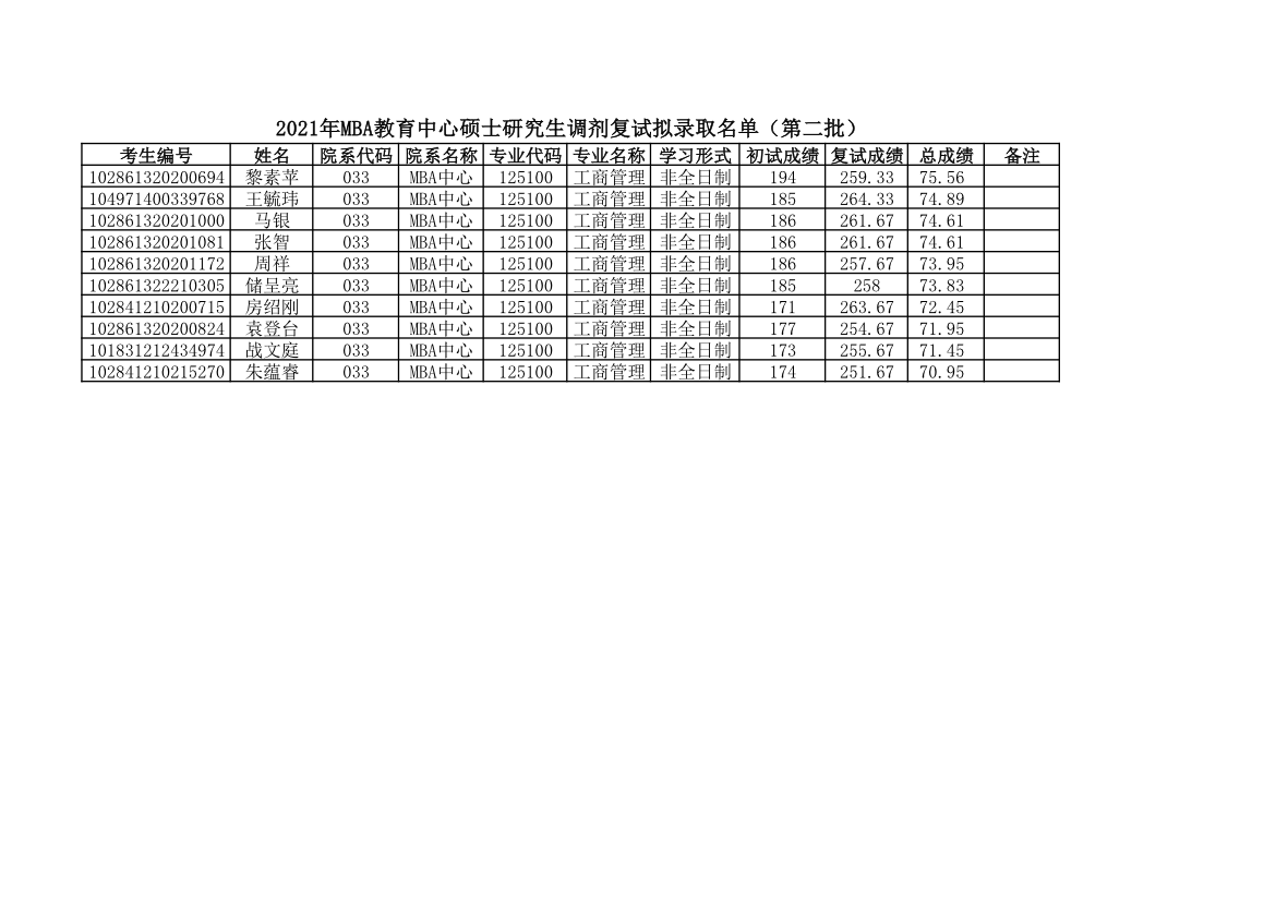 原文標題:2021年MBA教育中心碩士研究生調劑復試擬錄取名單(第二批)