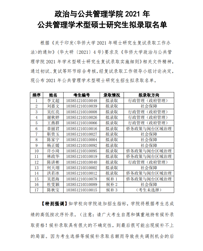 2021考研擬錄取名單:華僑大學政治與公共管理學院2021年公共管理學術型碩士研究生擬錄取名單
