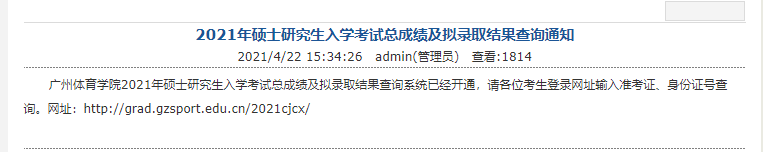 廣州體育學院2021年碩士研究生入學考試總成績及擬錄取結果查詢系統已經開通,請各位考生登錄網址輸入準考證、身份證號查詢。網址:http://grad.gzsport.edu.cn/2021cjcx/