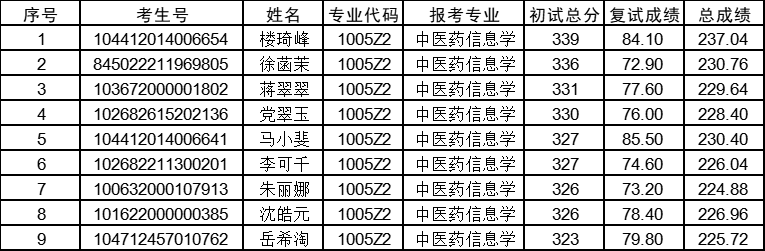 以上就是“2022考研擬錄取名單:長(zhǎng)春中醫(yī)藥大學(xué)2022年碩士研究生招生考試醫(yī)藥信息學(xué)院調(diào)劑考生擬錄取公示”的全部?jī)?nèi)容,更多錄取名單相關(guān)內(nèi)容請(qǐng)持續(xù)關(guān)注本網(wǎng)站。