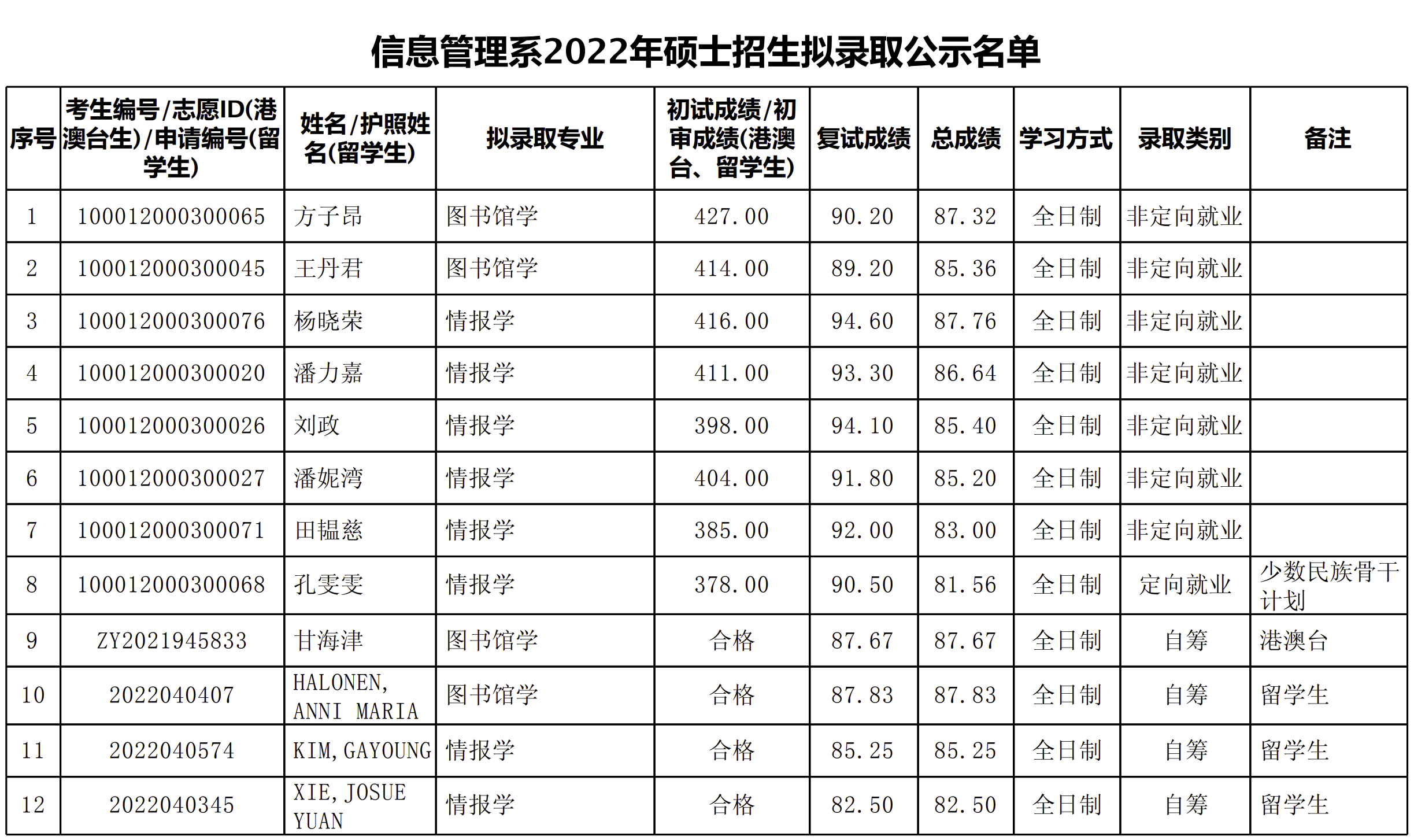 原文標題:信息管理系2022年碩士招生擬錄取公示名單