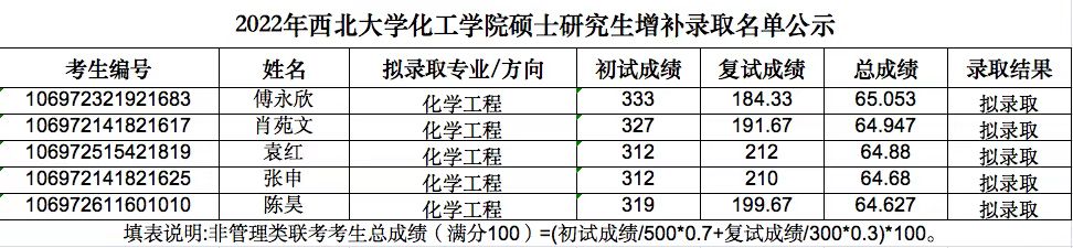 以上就是“2022考研擬錄取名單:西北大學(xué)化工學(xué)院2022年碩士研究生招生增補(bǔ)錄取公示”的全部內(nèi)容,更多錄取名單相關(guān)內(nèi)容請持續(xù)關(guān)注本網(wǎng)站。