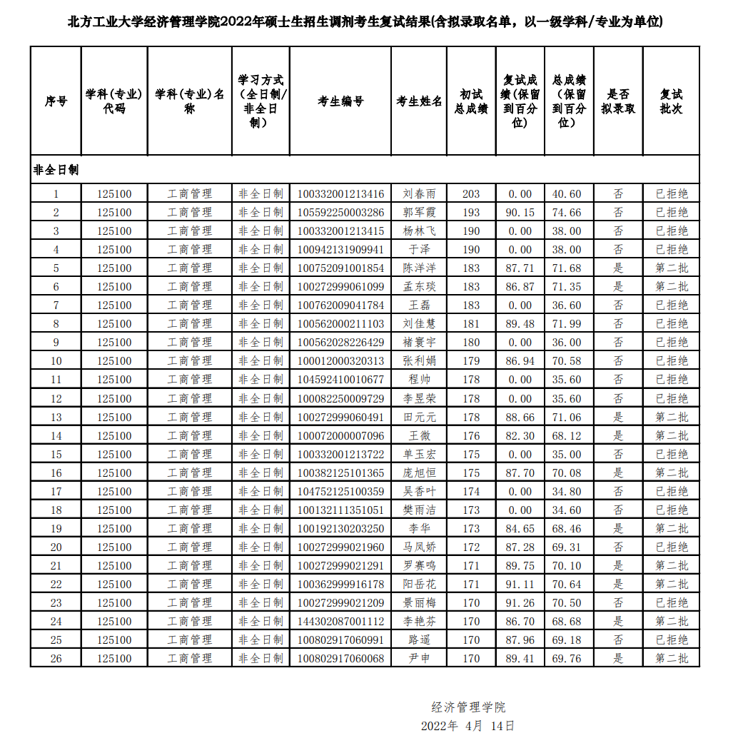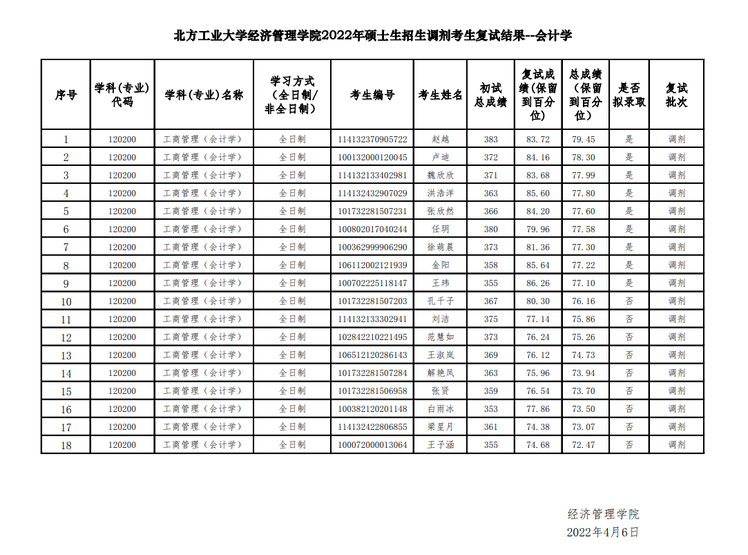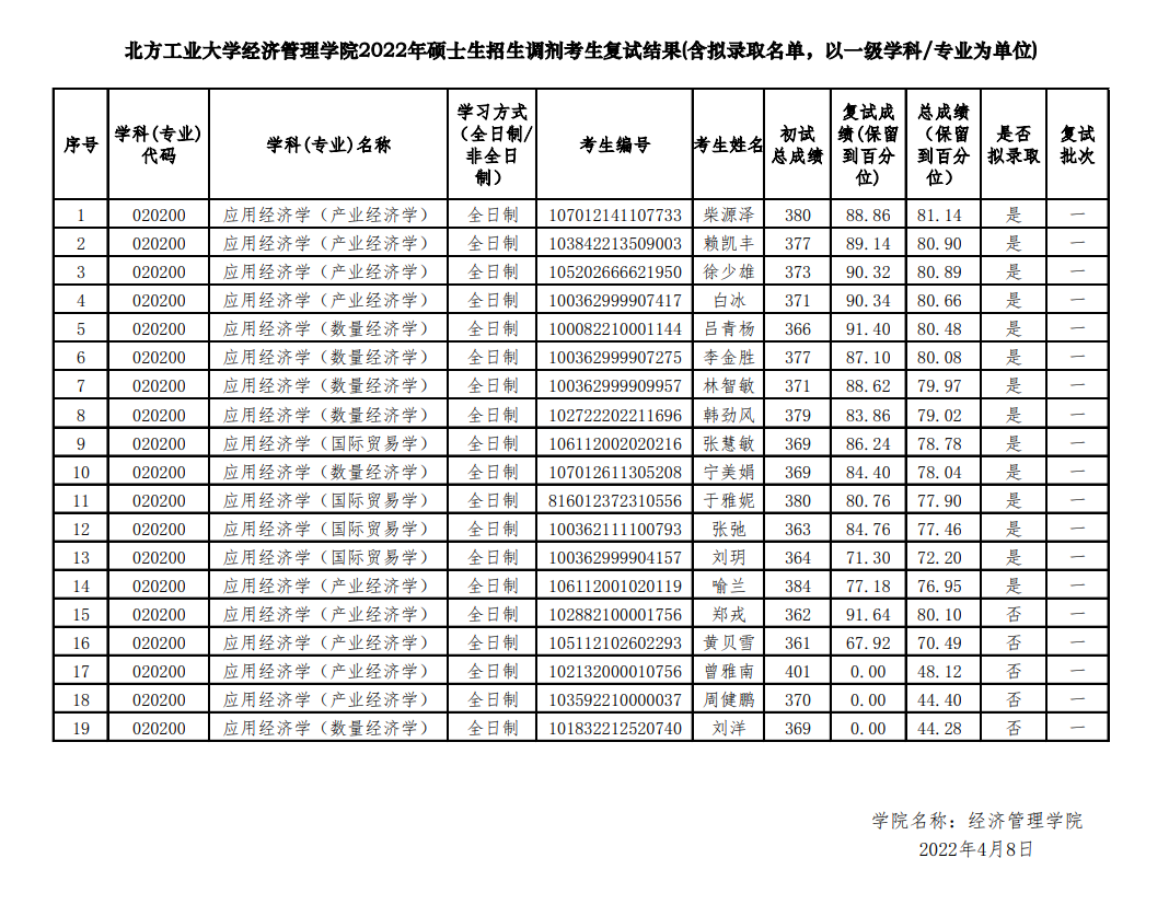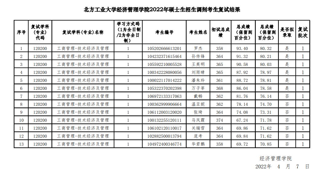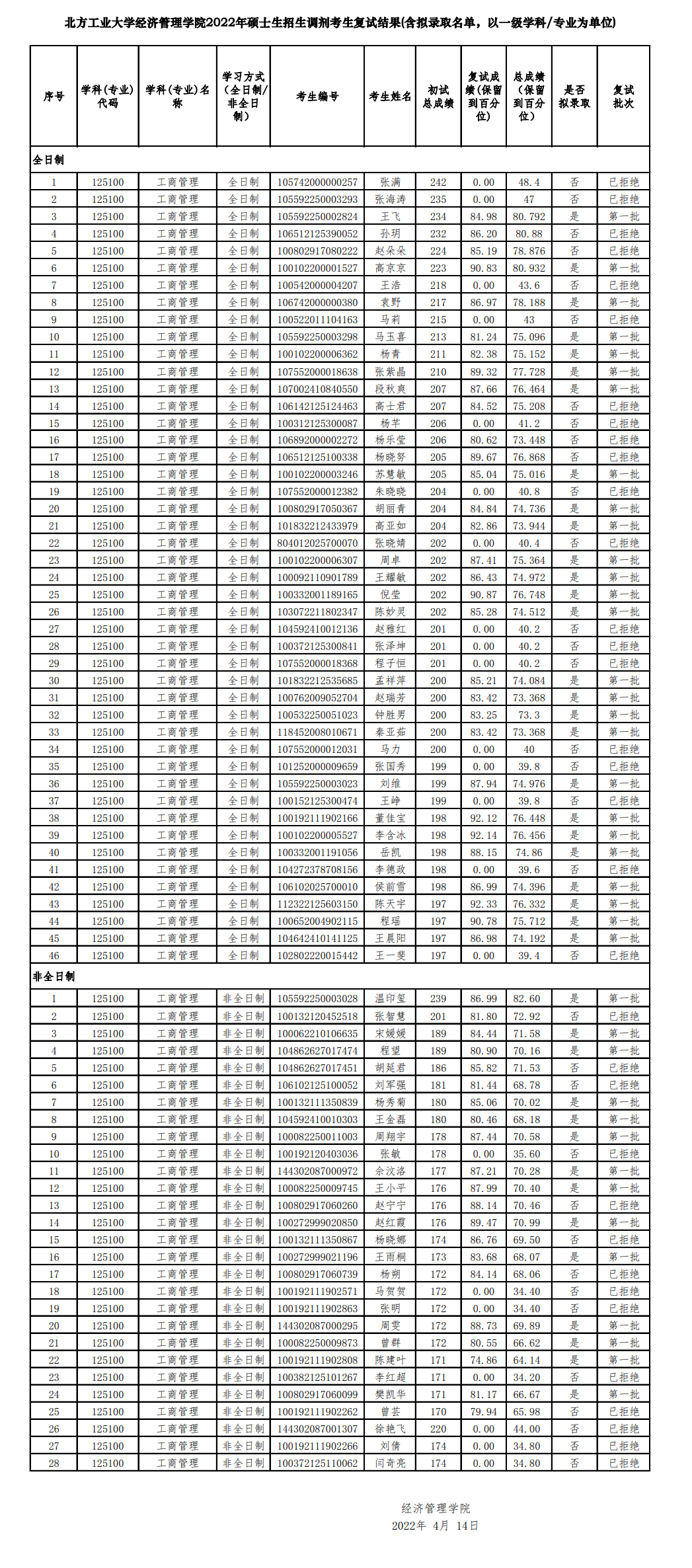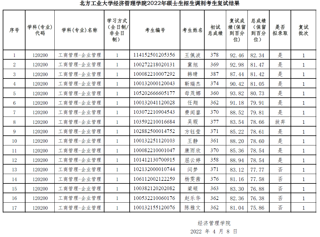 以上就是“2022考研擬錄取名單:北方工業大學經濟管理學院2022年碩士研究生招生復試結果匯總”的全部內容,更多錄取名單相關內容請持續關注本網站。