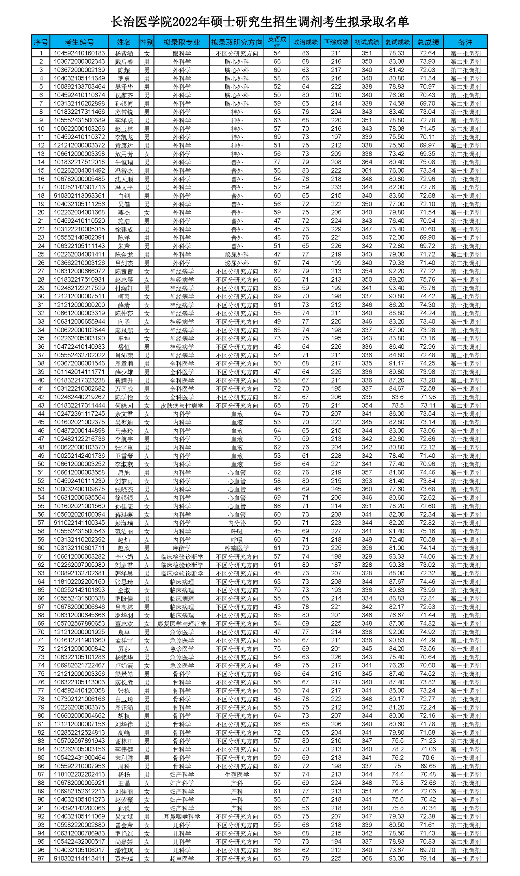 附件:長治醫(yī)學院2022年碩士研究生招生調(diào)劑考生擬錄取名單