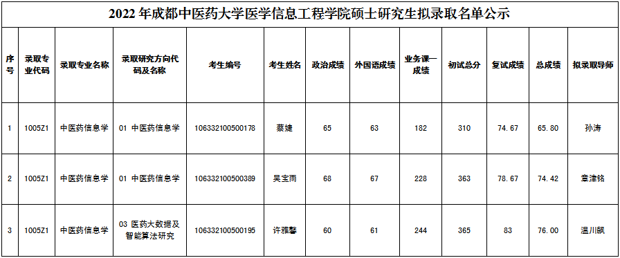 原文標(biāo)題:2022年成都中醫(yī)藥大學(xué)醫(yī)學(xué)信息工程學(xué)院碩士研究生擬錄取名單公示