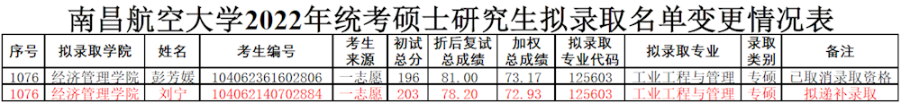 原文標題:關于南昌航空大學2022年統考碩士研究生招生遞補擬錄取名單的公示