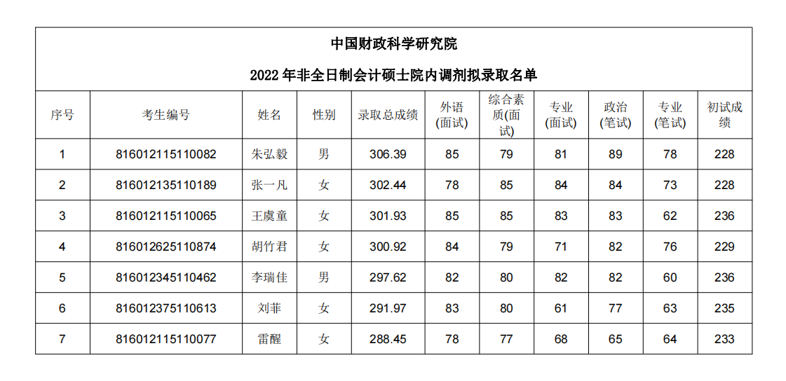 原文標(biāo)題:中國財政科學(xué)研究院2022年非全日制會計碩士院內(nèi)調(diào)劑擬錄取名單
