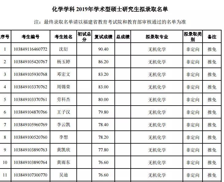 廈門大學(xué)化學(xué)學(xué)科2019年學(xué)術(shù)型碩士研究生擬錄取名單