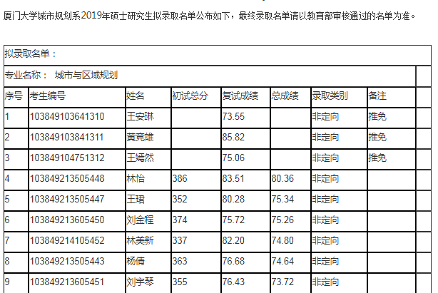 2019城市規(guī)劃碩士研究生擬錄取名單