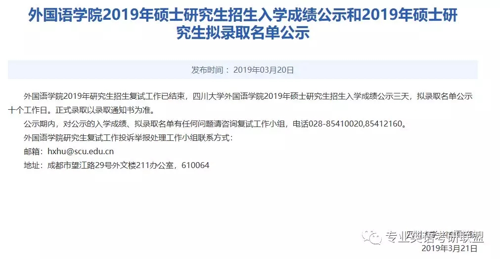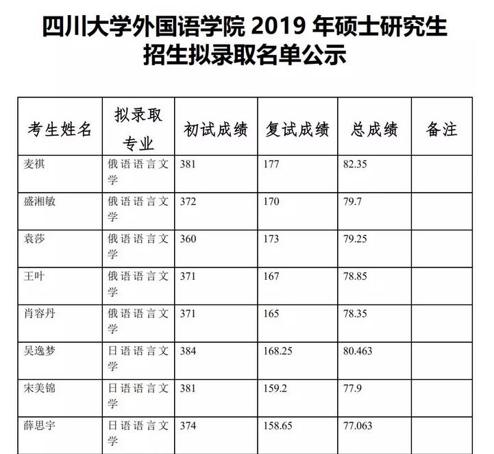 以上就是“四川大學外國語學院2019年研究生入學考試擬錄取名單”的全部內容,查看更多復試內容請點擊考研復試欄目。