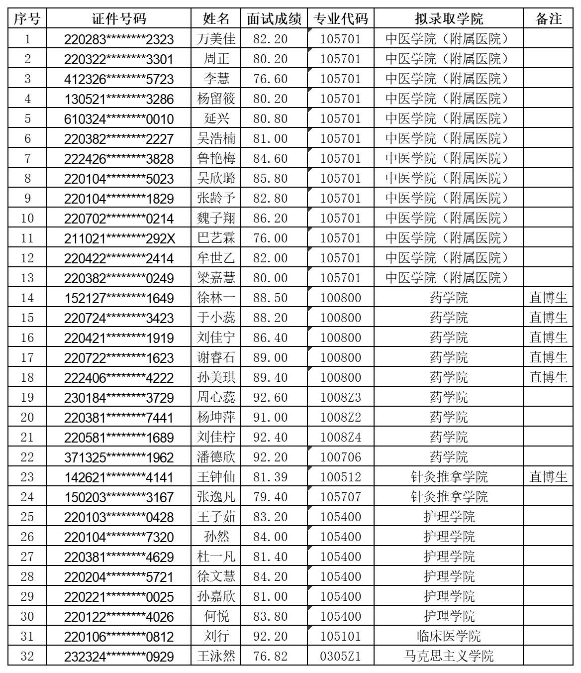 根據(jù)《長春中醫(yī)藥大學2023年接收推薦免試攻讀碩士研究生及本科直博生工作辦法》的條件和程序,本著“公平、公開、公正”的原則,各學院進行了嚴格的遴選,學校推免生工作領(lǐng)導小組對推免生資格進行了認真審核,擬錄取下列同學為我校2023級研究生,現(xiàn)匯總公示: