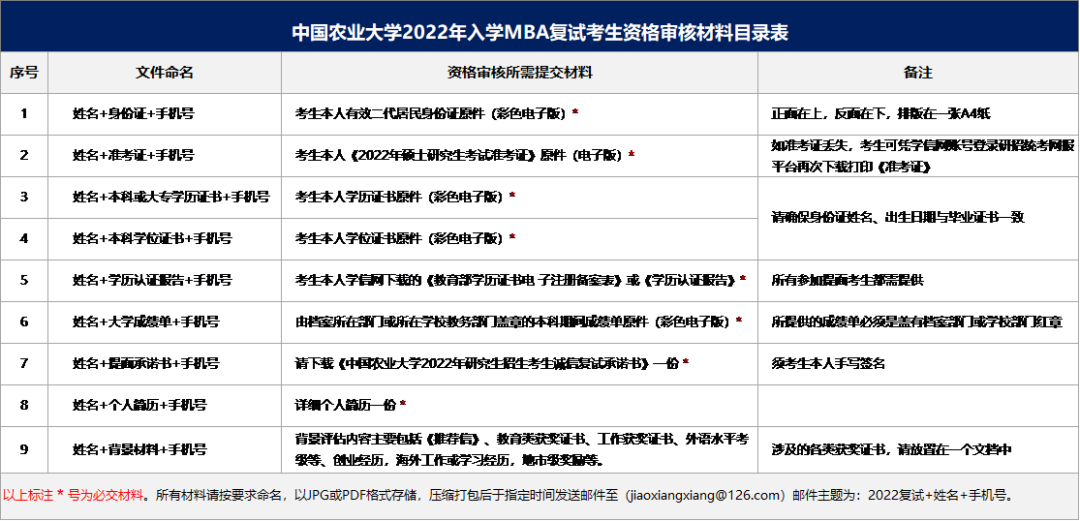以上資審材料目錄表,請仔細認真閱讀并按要求準備。并以壓縮包格式發送到指定郵箱(jiaoxiangxiang@126.com),附件命名為:2022復試+姓名+手機號。紙質版考生請留存,待錄取后于開學報到時提交。注意:承諾書要求考生本人親筆謄抄并簽名,紙質版留存,如錄取于開學報到時提交。