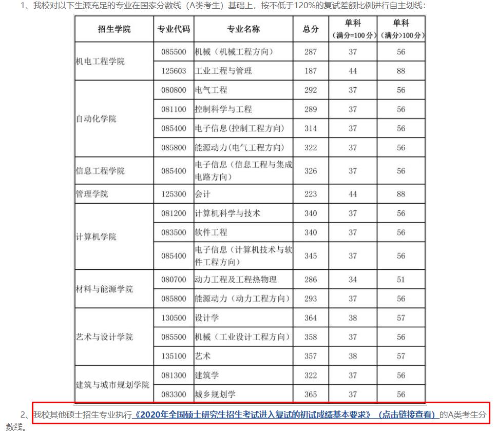 2020年全國碩士研究生招生考試考生進入復試的初試成績基本要求(專業(yè)學位類)A類175/44/88