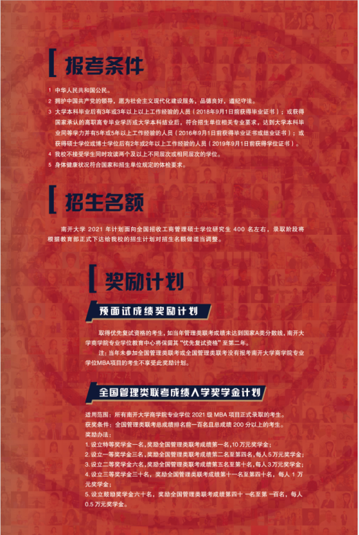 以上就是“2021MBA招生簡(jiǎn)章:南開大學(xué)2021年工商管理碩士(MBA)招生簡(jiǎn)章”的內(nèi)容了,更多考研信息,請(qǐng)持續(xù)關(guān)注研線網(wǎng)。