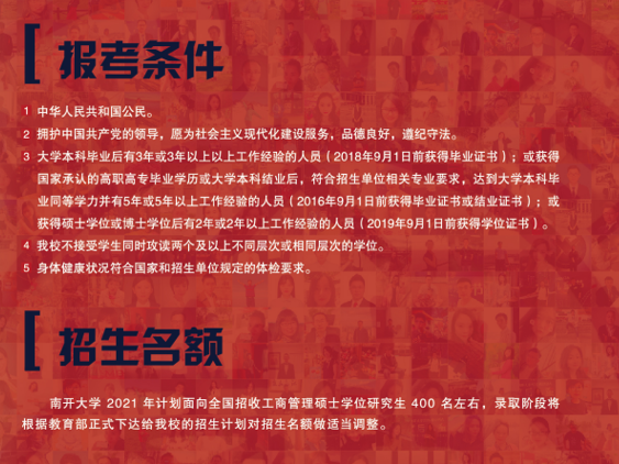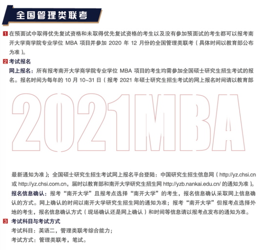 以上就是“2021MBA招生簡章:南開大學2021年工商管理碩士(MBA)招生簡章”的內容了,更多考研信息,請持續關注研線網。