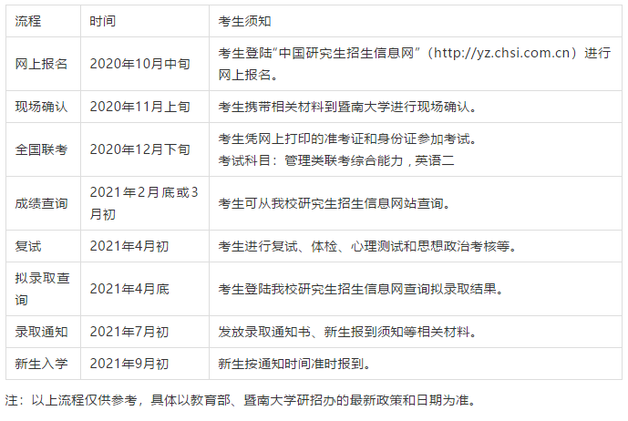以上就是“2021MBA招生簡章:暨南大學2021年工商管理碩士(MBA)招生簡章”的內容了,更多考研信息,請持續(xù)關注研線網。