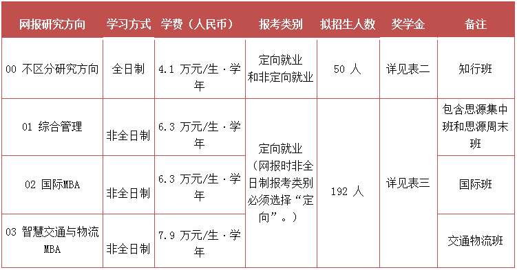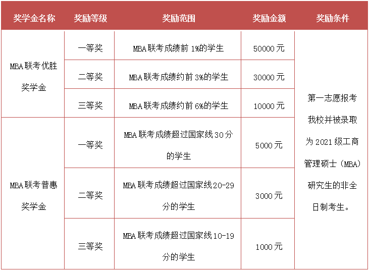為了鼓勵優(yōu)秀人才攻讀非全日制工商管理碩士(MBA),培養(yǎng)更多品學(xué)兼優(yōu)的商界精英,北京交通大學(xué)MBA教育中心特設(shè)立MBA聯(lián)考優(yōu)勝獎學(xué)金、MBA聯(lián)考普惠獎學(xué)金。其獎勵范圍、獎金額度和獎勵對象如表三所示。2021級非全日制MBA新生獎學(xué)金評選辦法詳見后續(xù)通知。若有變動,均以具體通知為準(zhǔn)。
