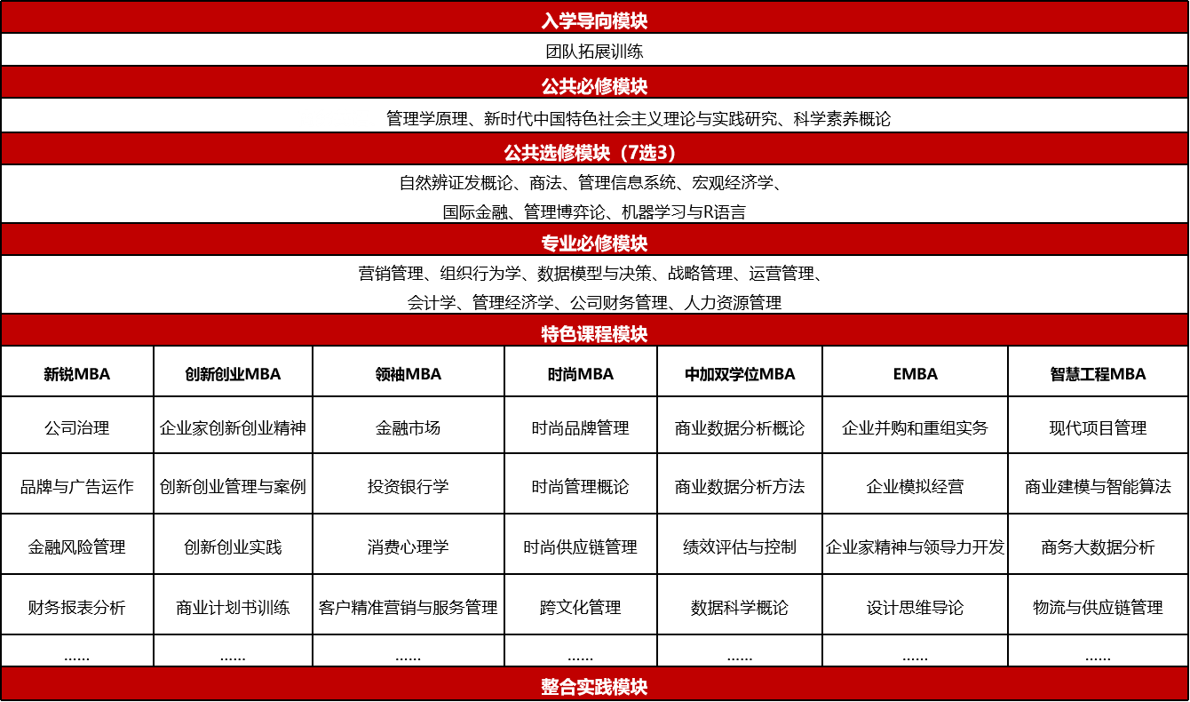 全日制創新創業MBA項目滿足雙創人才的學習需求,培養具有先進知識和管理素養的新生代雙創管理人才。課程體系涵蓋綜合管理類課程,引入創新創業課程模塊,激發學生創新創業思維,關注學生創新創業能力的提高。