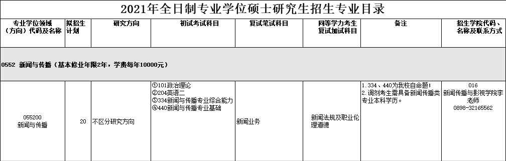 以上是“2021考研專業(yè)目錄:海南師范大學(xué)2021新傳碩士研究生考研專業(yè)目錄”的全部內(nèi)容,有需要趕緊記下來!考研必勝!